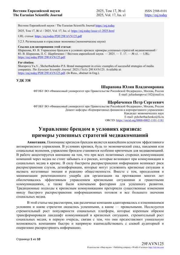 Шарапова, Ю.В. Управление брендом в условиях кризиса: примеры успешных стратегий медиакомпаний / Ю.В. Шарапова, П.С. Щербаченко. — Текст: электронный // Вестник Евразийской науки. – 2025. – № s1. — URL: https://esj.today/PDF/57FAVN125.pdf (дата обращения: 09.10.2025) — <URL:http://elib.fa.ru/art2025/bv1615.pdf>.