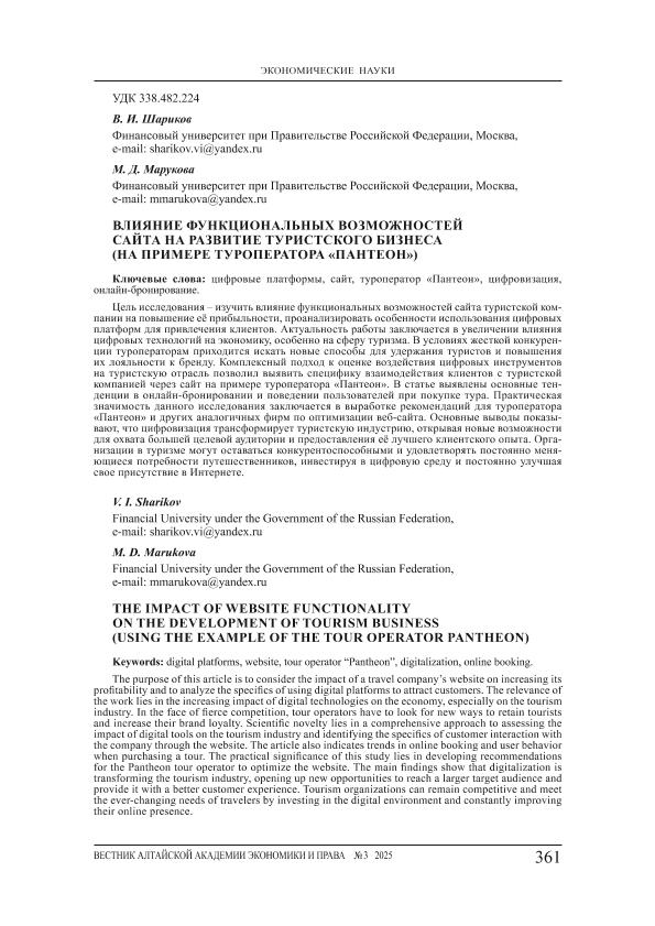 Шариков, В.И. Влияние функциональных возможностей сайта на развитие туристского бизнеса (на примере туроператора «Пантеон») / В.И. Шариков, М.Д. Марукова // Вестник Алтайской академии экономики и права. – 2025. – № 3-2. — С. 361-368. — Только в электронном виде. — <URL:http://elib.fa.ru/art2025/bv1616.pdf>.