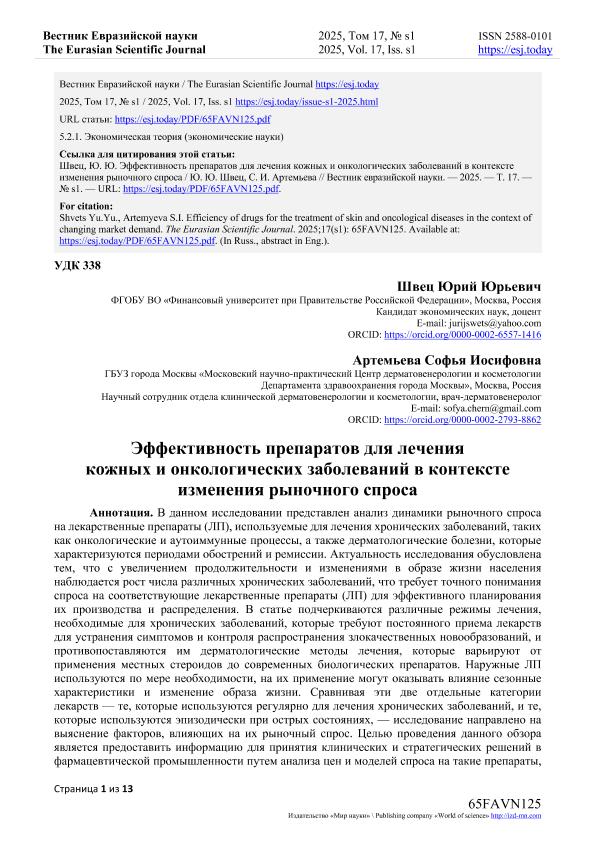 Швец, Ю.Ю. Эффективность препаратов для лечения кожных и онкологических заболеваний в контексте изменения рыночного спроса / Ю.Ю. Швец, С.И. Артемьева. — Текст: электронный // Вестник Евразийской науки. – 2025. – № s1. — URL: https://esj.today/PDF/65FAVN125.pdf (дата обращения: 09.10.2025) — <URL:http://elib.fa.ru/art2025/bv1622.pdf>.
