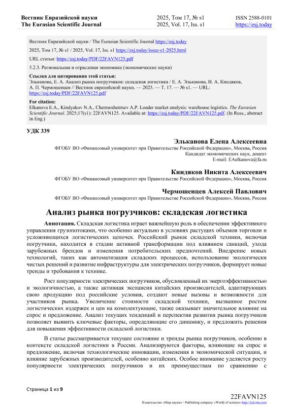 Эльканова, ЕА. Анализ рынка погрузчиков: складская логистика / ЕА. Эльканова, Н.А. Киндяков, А.П. Чермошенцев. — Текст: электронный // Вестник Евразийской науки. – 2025. – № s1. — URL: https://esj.today/PDF/22FAVN125.pdf (дата обращения: 09.10.2025) — <URL:http://elib.fa.ru/art2025/bv1637.pdf>.