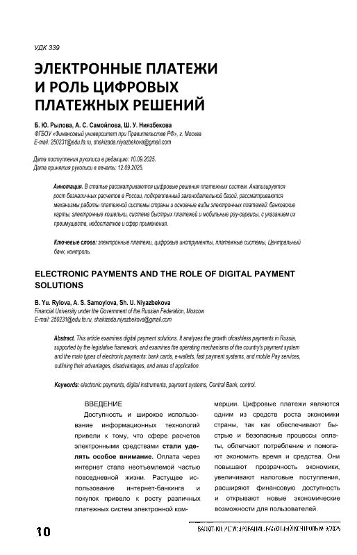 Рылова, Б.Ю. Электронные платежи и роль цифровых платежных решений / Б.Ю. Рылова, А.С. Самойлова, Ш.У. Ниязбекова // Валютное регулирование.Валютный контроль. – 2025. – № 9. — С. 10-17 — <URL:http://elib.fa.ru/art2025/bv1549.pdf>.
