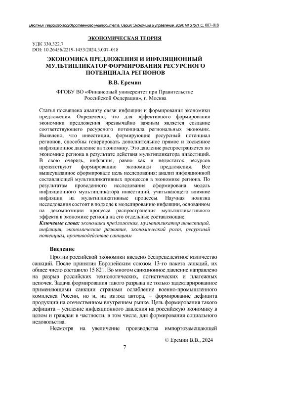 Еремин, В.В. Экономика предложения и инфляционный мультипликатор формирования ресурсного потенциала регионов // Вестник Тверского государственного университета. Серия: Экономика и управление. – 2024. – № 3. — С. 007-018. — Только в электронном виде. — <URL:http://elib.fa.ru/art2024/bv3355.pdf>.