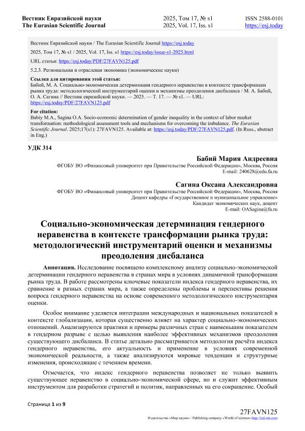 Бабий, М.А. Социально-экономическая детерминация гендерного неравенства в контексте трансформации рынка труда: методологический инструментарий оценки и механизмы преодоления дисбаланса / М.А. Бабий, О.А. Сагина. — Текст: электронный // Вестник Евразийской науки. – 2025. – № s1. — URL: https://esj.today/PDF/27FAVN125.pdf (дата обращения: 17.09.2025) — <URL:http://elib.fa.ru/art2025/bv349.pdf>.