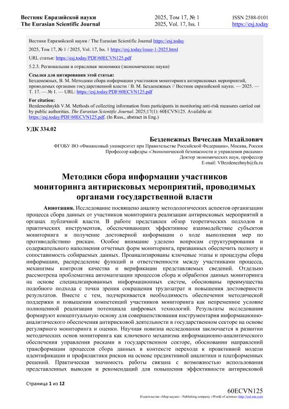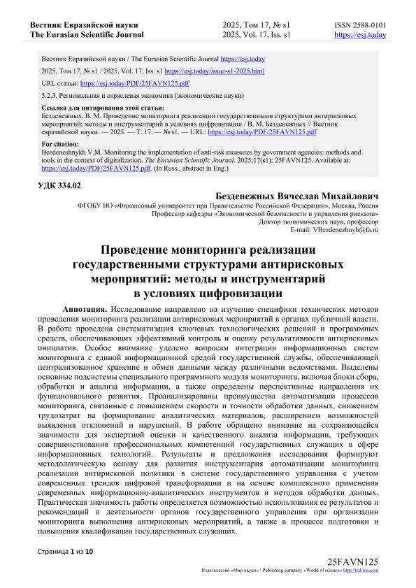 Безденежных, В.М. Проведение мониторинга реализации государственными структурами антирисковых мероприятий: методы и инструментарий в условиях цифровизации. — Текст: электронный // Вестник Евразийской науки. – 2025. – № s1. — URL: https://esj.today/PDF/25FAVN125.pdf (дата обращения: 17.09.2025) — <URL:http://elib.fa.ru/art2025/bv375.pdf>.
