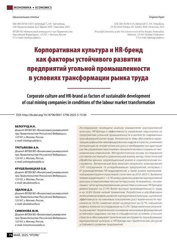 Корпоративная культура и HR-бренд как факторы устойчивого развития предприятий угольной промышленности в условиях трансформации рынка труда / И.Н. Белогруд, А.Н. Третьякова, О.И. Крушельницкая [и др.] // Уголь. – 2025. – № 5. — С. 74-84. — Только в электронном виде. — <URL:http://elib.fa.ru/art2025/bv376.pdf>.
