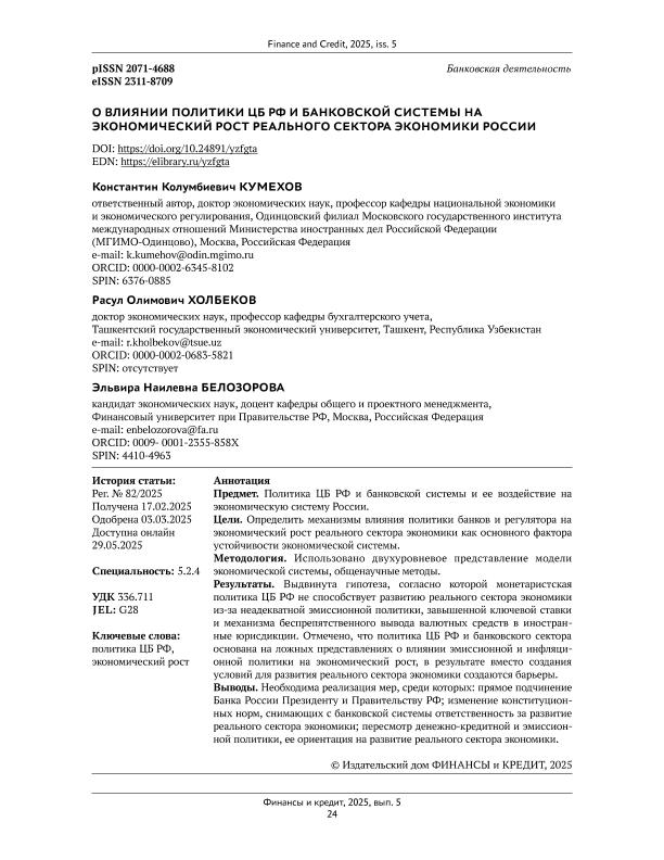 Кумехов, К.К. О влиянии политики ЦБ РФ и банковской системы на экономический рост реального сектора экономики России / К.К. Кумехов, Р.О. Холбеков, Э.Н. Белозорова // Финансы и кредит. – 2025. – № 5. — С. 24-41. — Только в электронном виде. — <URL:http://elib.fa.ru/art2025/bv377.pdf>.
