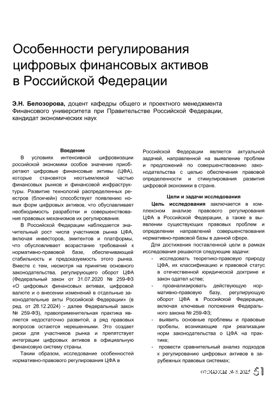 Белозорова, Э.Н. Особенности регулирования цифровых финансовых активов в Российской Федерации // Финансы. – 2025. – № 8. — С. 51-57 — <URL:http://elib.fa.ru/art2025/bv378.pdf>.