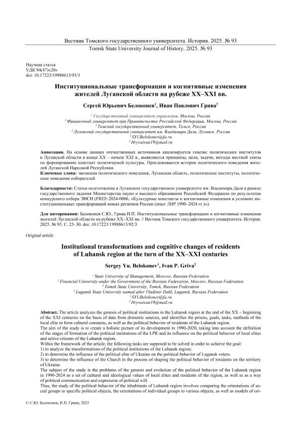 Белоконев, С.Ю. Институциональные трансформации и когнитивные изменения жителей Луганской области на рубеже XX–XXI вв. / С.Ю. Белоконев, И.П. Грива // Вестник Томского государственного университета. История. – 2025. – № 93. — С. 25-30. — Только в электронном виде. — <URL:http://elib.fa.ru/art2025/bv379.pdf>.