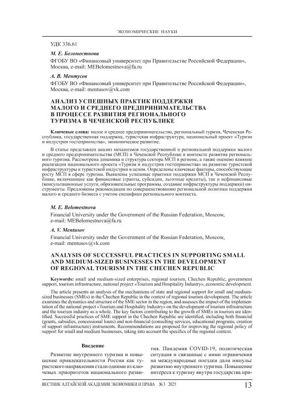 Беломестнова, М.Е. Анализ успешных практик поддержки малого и среднего предпринимательства в процессе развития регионального туризма в Чеченской Республике / М.Е. Беломестнова, А.В. Ментусов // Вестник Алтайской академии экономики и права. – 2025. – № 3-1. — С. 13-18. — Только в электронном виде. — <URL:http://elib.fa.ru/art2025/bv380.pdf>.