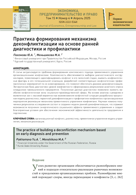 Пахомова, Ю.А. Практика формирования механизма деконфликтизации на основе ранней диагностики и профилактики / Ю.А. Пахомова, М.А. Меньшикова // Экономика, предпринимательство и право. – 2025. – № 4. — С. 2363–2380. — Только в электронном виде. — <URL:http://elib.fa.ru/art2025/bv1518.pdf>.