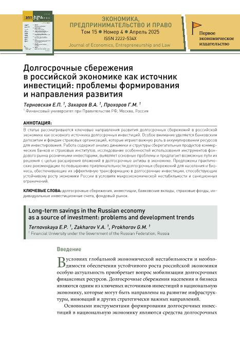 Терновская, Е.П. Долгосрочные сбережения в российской экономике как источник инвестиций: проблемы формирования и направления развития / Е.П. Терновская, В.А. Захаров, Г.М. Прохоров // Экономика, предпринимательство и право. – 2025. – № 4. — С. 2919–2934. — Только в электронном виде. — <URL:http://elib.fa.ru/art2025/bv1598.pdf>.