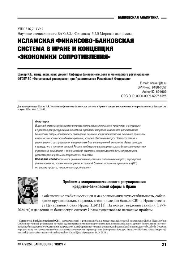 Шакер, И.Е. Исламская финансово-банковская система в Иране и концепция «экономики сопротивления» // Банковские услуги. – 2024. – № 4. — С. 21-32. — Только в электронном виде. — <URL:http://elib.fa.ru/art2024/bv3312.pdf>.