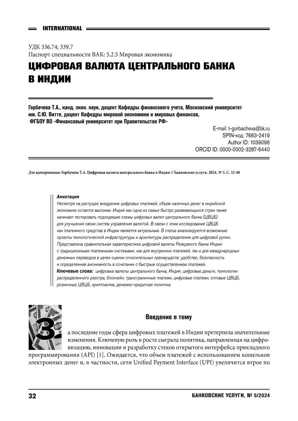 Горбачева, Т.А. Цифровая валюта центрального банка в Индии // Банковские услуги. – 2024. – № 5. — С. 32-40. — Только в электронном виде. — <URL:http://elib.fa.ru/art2024/bv3313.pdf>.