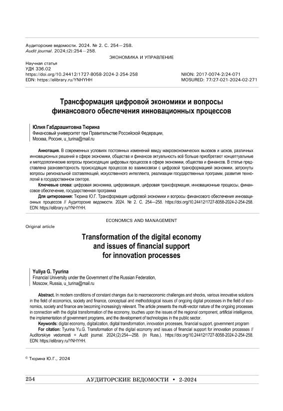 Тюрина, Ю.Г. Трансформация цифровой экономики и вопросы финансового обеспечения инновационных процессов // Аудиторские ведомости. – 2024. – № 2. — С. 254-258. — Только в электронном виде. — <URL:http://elib.fa.ru/art2024/bv3288.pdf>.