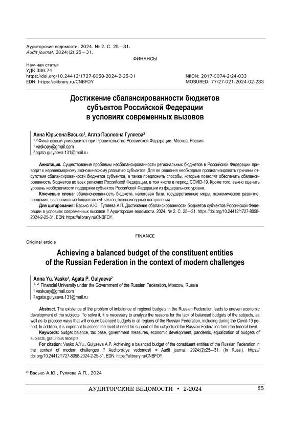 Васько, А.Ю. Достижение сбалансированности бюджетов субъектов Российской Федерации в условиях современных вызовов / А.Ю. Васько, А.П. Гуляева // Аудиторские ведомости. – 2024. – № 2. — С. 25-31. — Только в электронном виде. — <URL:http://elib.fa.ru/art2024/bv3289.pdf>.