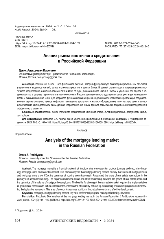 Подоляко, Д.А. Анализ рынка ипотечного кредитования в Российской Федерации // Аудиторские ведомости. – 2024. – № 2. — С. 104-109. — Только в электронном виде. — <URL:http://elib.fa.ru/art2024/bv3291.pdf>.
