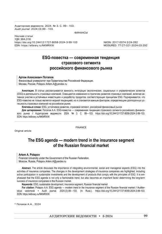 Потапов, А.А. ESG-повестка — современная тенденция страхового сегмента российского финансового рынка // Аудиторские ведомости. – 2024. – № 3. — С. 99-103. — Только в электронном виде. — <URL:http://elib.fa.ru/art2024/bv3292.pdf>.