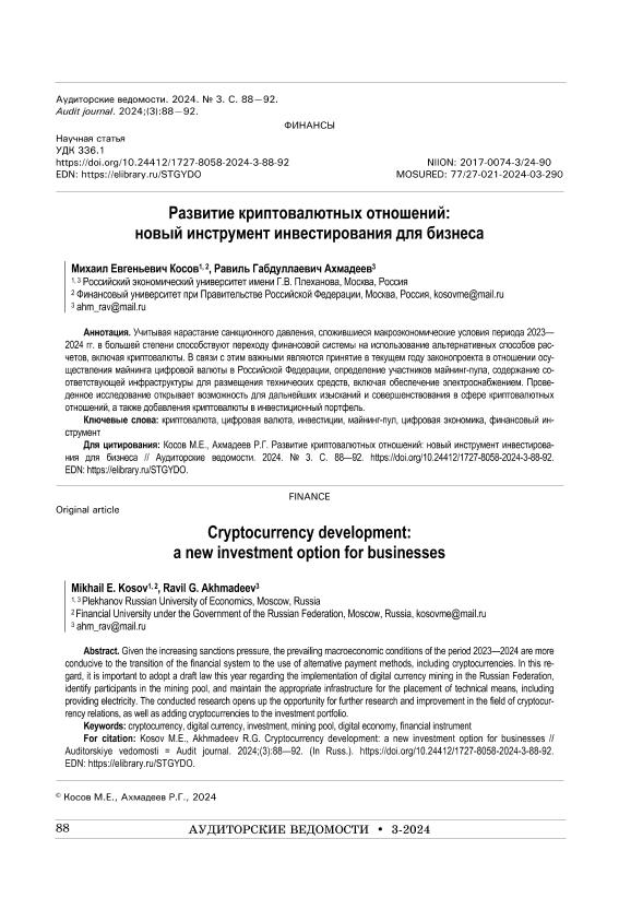 Косов, М.Е. Развитие криптовалютных отношений: новый инструмент инвестирования для бизнеса / М.Е. Косов, Р.Г. Ахмадеев // Аудиторские ведомости. – 2024. – № 3. — С. 88-92. — Только в электронном виде. — <URL:http://elib.fa.ru/art2024/bv3293.pdf>.