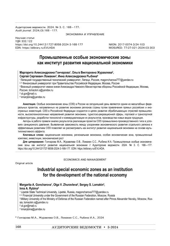 Промышленные особые экономические зоны как институт развития национальной экономики / М.А. Гончарова, О.В. Журавлева, С.С. Ломакин, И.А. Рыбина // Аудиторские ведомости. – 2024. – № 3. — С. 168-177. — Только в электронном виде. — <URL:http://elib.fa.ru/art2024/bv3295.pdf>.