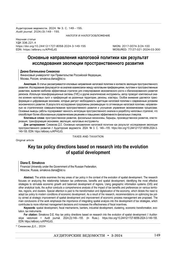 Симакова, Д.Е. Основные направления налоговой политики как результат исследования эволюции пространственного развития // Аудиторские ведомости. – 2024. – № 3. — С. 149-155. — Только в электронном виде. — <URL:http://elib.fa.ru/art2024/bv3296.pdf>.