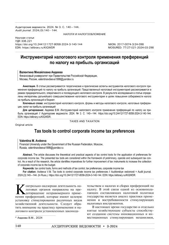 Авдеева, В.М. Инструментарий налогового контроля применения преференций по налогу на прибыль организаций // Аудиторские ведомости. – 2024. – № 3. — С. 140-144. — Только в электронном виде. — <URL:http://elib.fa.ru/art2024/bv3297.pdf>.