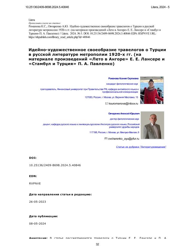 материале произведений «Лето в Ангоре» Е. E. Лансере и «Стамбул и Турция» П. А. Павленко) / К.С. Романова, А.Ю. Овчаренко. — Текст: электронный // Litera. – 2024. – № 5. — C. 32-40. - URL: https://nbpublish.com/library_read_article.php?id=40846. - Дата публикации: 08.05.2024 — <URL:http://elib.fa.ru/art2024/bv3281.pdf>.