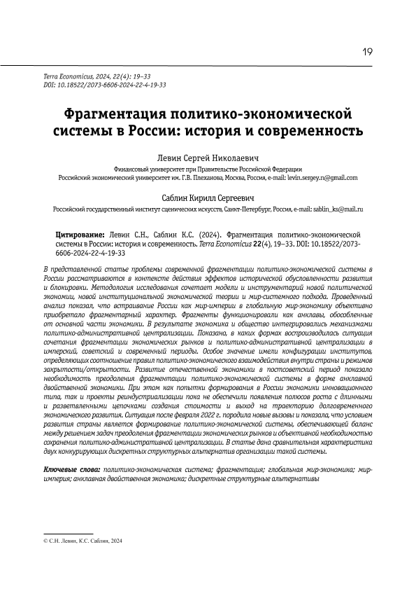 Левин, С.Н. Фрагментация политико-экономической системы в России: история и современность / С.Н. Левин, К.С. Саблин // Terra Economicus. – 2024. – № 4. — С. 19-33. — Только в электронном виде. — <URL:http://elib.fa.ru/art2024/bv3263.pdf>.