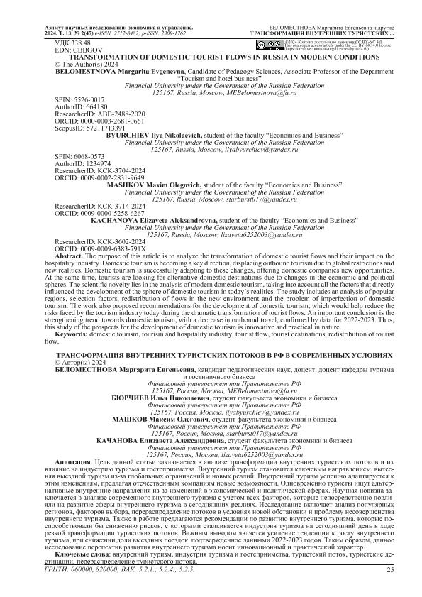 Transformation of Domestic Tourist Flows in Russia in Modern Conditions = Трансформация внутренних туристских потоков в РФ в современных условиях / Belomestnova M.E. (Беломестнова М.Е.), Byurchiev I.N. (Бюрчиев И.Н.), Mashkov M.O. (Машков М.О.), Kachanova E.A. (Качанова Е.А.) // Азимут научных исследований: экономика и управление. – 2024. – № 2. — С. 25-28. — Только в электронном виде. — <URL:http://elib.fa.ru/art2024/bv3265.pdf>.