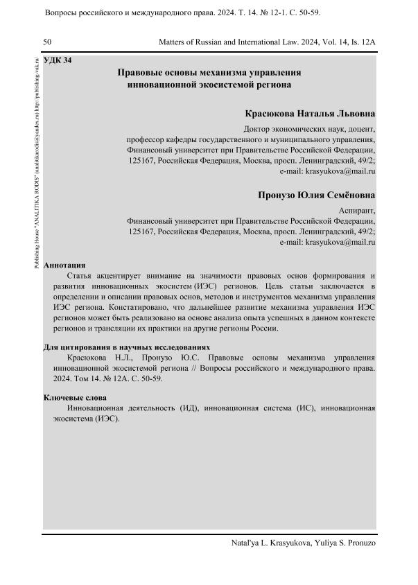 Красюкова, Н.Л. Правовые основы механизма управления инновационной экосистемой региона / Н.Л. Красюкова, Ю.С. Пронузо // Вопросы российского и международного права. – 2024. – № 12А. — С. 50-59. — Только в электронном виде. — <URL:http://elib.fa.ru/art2024/bv3747.pdf>.
