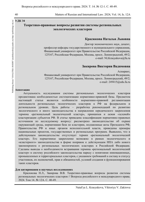 Красюкова, Н.Л. Теоретико-правовые вопросы развития системы региональных экологических кластеров / Н.Л. Красюкова, В.В. Закирова // Вопросы российского и международного права. – 2024. – № 12А. — С. 40-49. — Только в электронном виде. — <URL:http://elib.fa.ru/art2024/bv3748.pdf>.