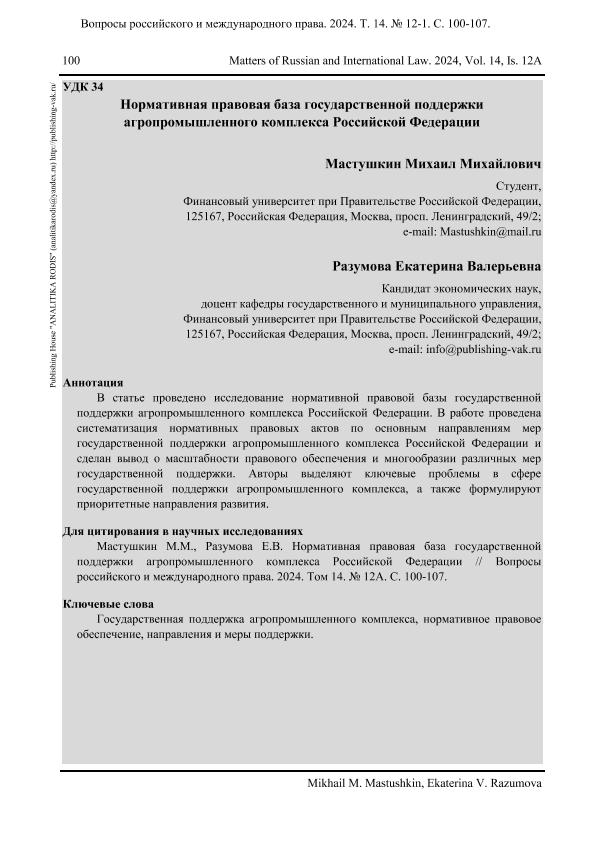 Мастушкин, М.М. Нормативная правовая база государственной поддержки агропромышленного комплекса Российской Федерации / М.М. Мастушкин, Е.В. Разумова // Вопросы российского и международного права. – 2024. – № 12А. — С. 100-107. — Только в электронном виде. — <URL:http://elib.fa.ru/art2024/bv3753.pdf>.