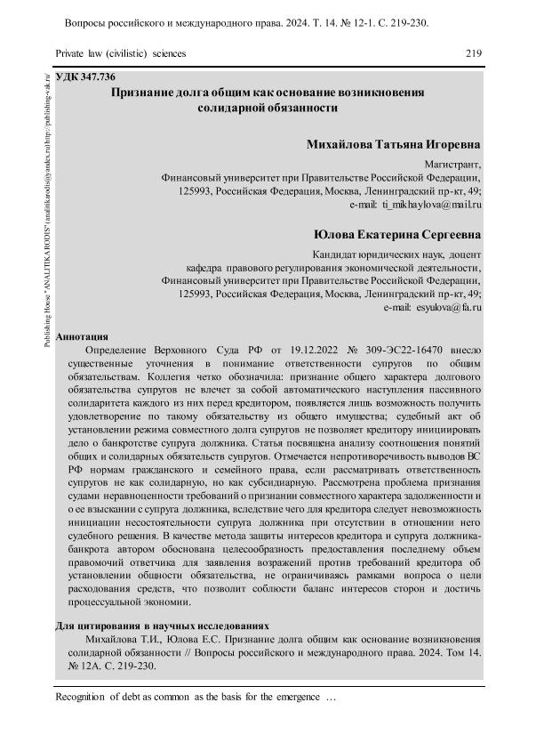 Михайлова, Т.И. Признание долга общим как основание возникновения солидарной обязанности / Т.И. Михайлова, Е.С. Юлова // Вопросы российского и международного права. – 2024. – № 12А. — С. 219-230. — Только в электронном виде. — <URL:http://elib.fa.ru/art2024/bv3754.pdf>.