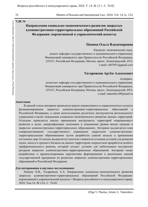 Панина, О.В. Направления социально-экономического развития закрытых административно-территориальных образований Российской Федерации: нормативный и управленческий аспекты / О.В. Панина, А.А. Татарников // Вопросы российского и международного права. – 2024. – № 12А. — С. 76-82. — Только в электронном виде. — <URL:http://elib.fa.ru/art2024/bv3762.pdf>.