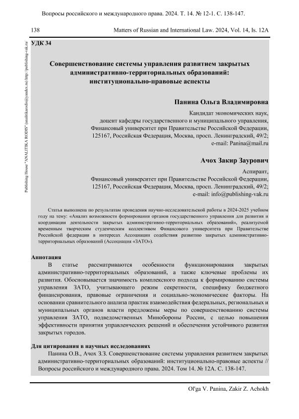 Панина, О.В. Совершенствование системы управления развитием закрытых административно-территориальных образований: институционально-правовые аспекты // Вопросы российского и международного права. – 2024. – № 12А. — С. 138-147. — Только в электронном виде. — <URL:http://elib.fa.ru/art2024/bv3763.pdf>.