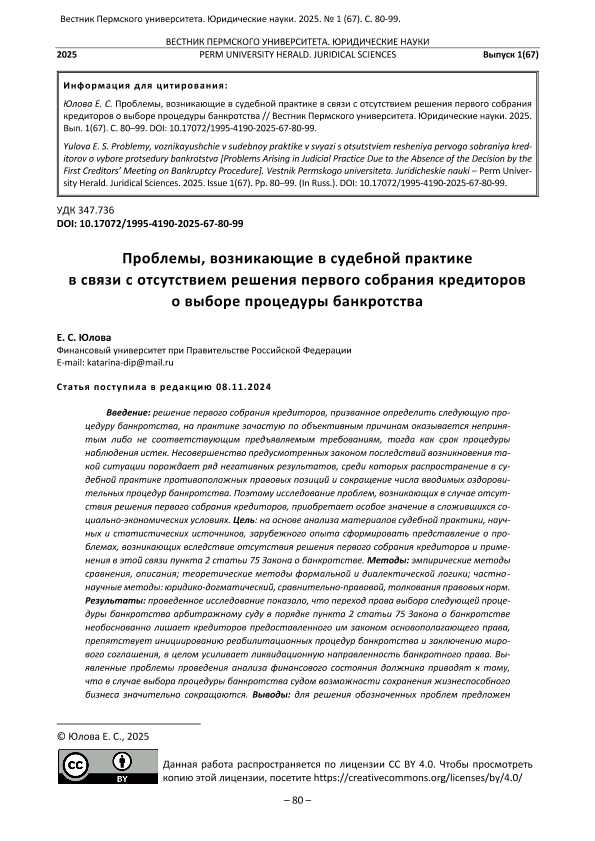 Юлова, Е.С. Проблемы, возникающие в судебной практике в связи с отсутствием решения первого собрания кредиторов о выборе процедуры банкротства // Вестник Пермского университета. Серия: Юридические науки. – 2025. – № 1. — С. 80-99. — Только в электронном виде. — <URL:http://elib.fa.ru/art2025/bv1640.pdf>.