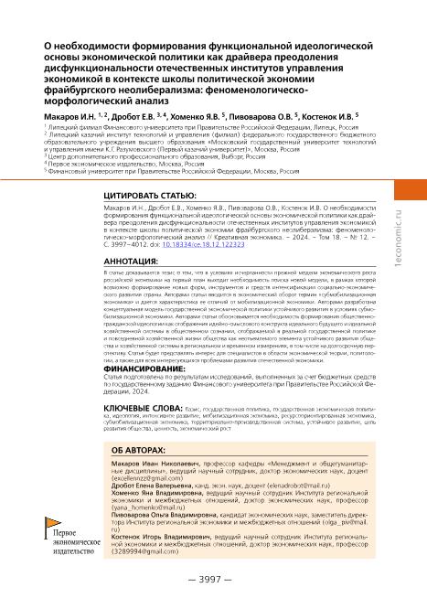 О необходимости формирования функциональной идеологической основы экономической политики как драйвера преодоления дисфункциональности отечественных институтов управления экономикой в контексте школы политической экономии фрайбургского неолиберализма: феноменологическо-морфологический анализ / И.Н. Макаров, Е.В. Дробот, Я.В. Хоменко [и др.] // Креативная экономика. – 2024. – № 12. — С. 3997-4012. — Только в электронном виде. — <URL:http://elib.fa.ru/art2024/bv3657.pdf>.