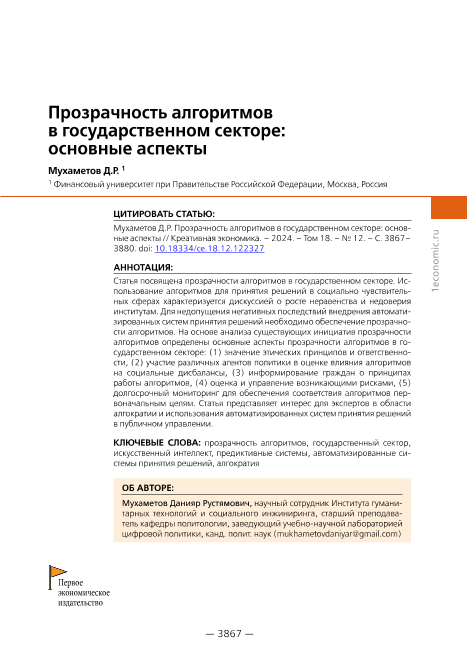 Мухаметов, Д.Р. Прозрачность алгоритмов в государственном секторе: основные аспекты // Креативная экономика. – 2024. – № 12. — С. 3867-3880. — Только в электронном виде. — <URL:http://elib.fa.ru/art2024/bv3660.pdf>.