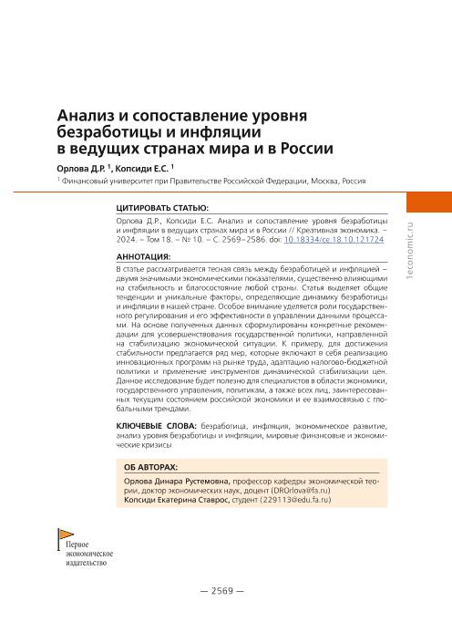 Орлова, Д.Р. Анализ и сопоставление уровня безработицы и инфляции в ведущих странах мира и в России / Д.Р. Орлова, Е.С. Копсиди // Креативная экономика. – 2024. – № 10. — С. 2569-2586. — Только в электронном виде. — <URL:http://elib.fa.ru/art2024/bv3664.pdf>.