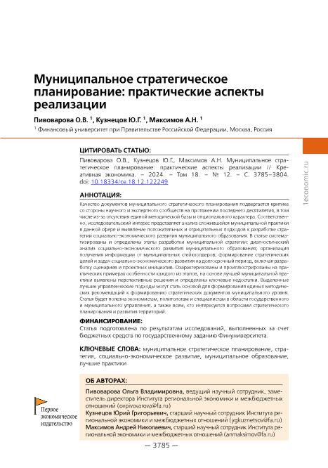 Пивоварова, О.В. Муниципальное стратегическое планирование: практические аспекты реализации / О.В. Пивоварова, Ю.Г. Кузнецов, А.Н. Максимов // Креативная экономика. – 2024. – № 12. — С. 3785-3804. — Только в электронном виде. — <URL:http://elib.fa.ru/art2024/bv3667.pdf>.