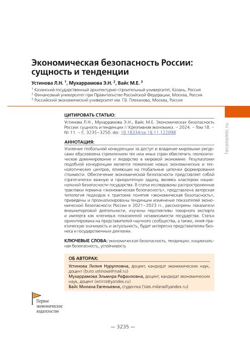 Устинова, Л.Н. Экономическая безопасность России: сущность и тенденции / Л.Н. Устинова, Э.H. Мухаррамова, М.Е. Вайс // Креативная экономика. – 2024. – № 11. — С. 3235-3250. — Только в электронном виде. — <URL:http://elib.fa.ru/art2024/bv3675.pdf>.