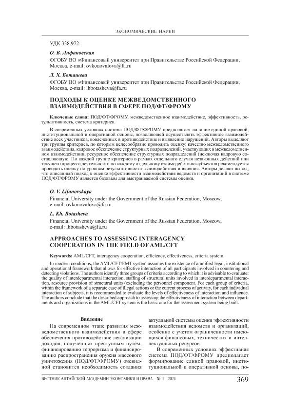 Лифановская, О.В. Подходы к оценке межведомственного взаимодействия в сфере ПОД/ФТ/ФРОМУ / О.В. Лифановская, Л.Х. Боташева // Вестник Алтайской академии экономики и права. – 2024. – № 11-3. — С. 369-374. — Только в электронном виде. — <URL:http://elib.fa.ru/art2024/bv3952.pdf>.