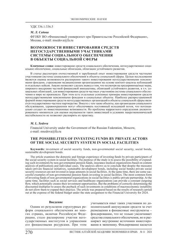 Седова, М.Л. Возможности инвестирования средств негосударственными участниками системы социального обеспечения в объекты социальной сферы // Вестник Алтайской академии экономики и права. – 2024. – № 11-2. — С. 270-276. — Только в электронном виде. — <URL:http://elib.fa.ru/art2024/bv3976.pdf>.