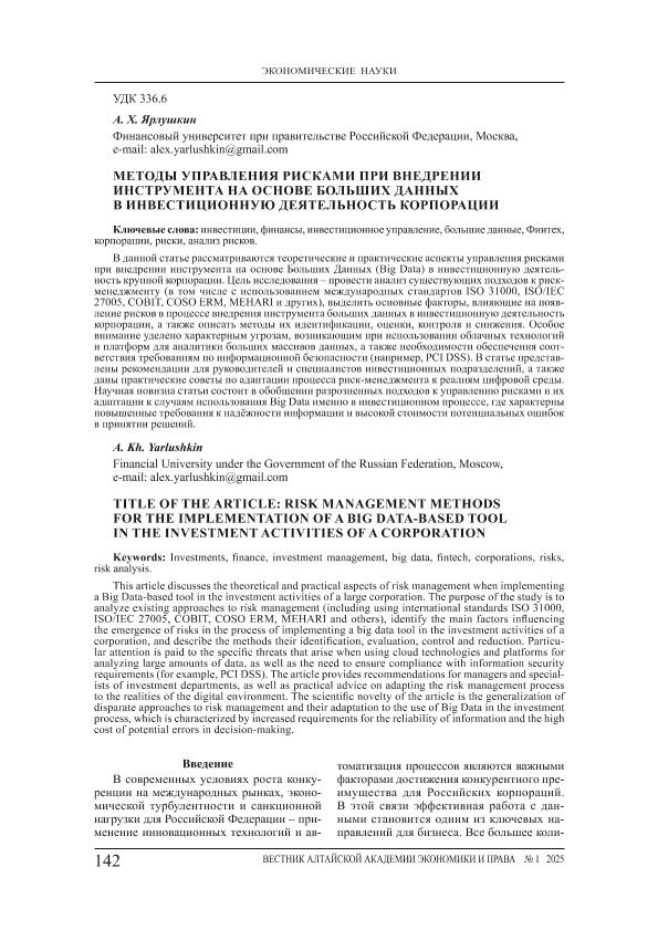 Ярлушкин, А.Х. Методы управления рисками при внедрении инструмента на основе больших данных в инвестиционную деятельность корпорации // Вестник Алтайской академии экономики и права. – 2025. – № 1. — С. 142-147. — Только в электронном виде. — <URL:http://elib.fa.ru/art2025/bv1645.pdf>.