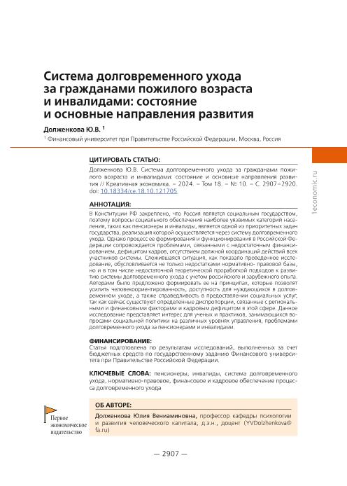 Долженкова, Ю.В. Система долговременного ухода за гражданами пожилого возраста и инвалидами: состояние и основные направления развития // Креативная экономика. – 2024. – № 10. — С. 2907-2920. — Только в электронном виде. — <URL:http://elib.fa.ru/art2024/bv3639.pdf>.