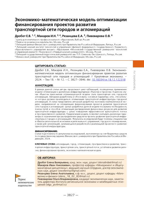 Экономико-математическая модель оптимизации финансирования проектов развития транспортной сети городов и агломераций / Е.В. Дробот, И.Н. Макаров, Е.А. Рязанцева, О.В. Пивоварова // Креативная экономика. – 2024. – № 12. — С. 3827-3846. — Только в электронном виде. — <URL:http://elib.fa.ru/art2024/bv3640.pdf>.