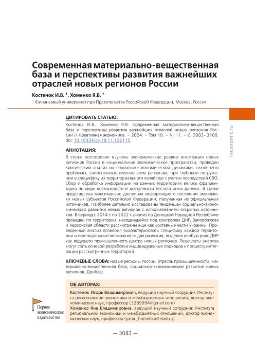 база и перспективы развития важнейших отраслей новых регионов России / И.В. Костенок, Я.В. Хоменко // Креативная экономика. – 2024. – № 11. — С. 3083-3106. — Только в электронном виде. — <URL:http://elib.fa.ru/art2024/bv3651.pdf>.
