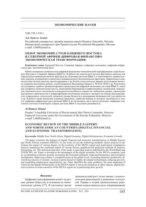 Аль Хумсси, А. Обзор экономик стран Ближнего Востока и Северной Африки (цифровая финансово-экономическая трансформация) // Вестник Алтайской академии экономики и права. – 2024. – № 12-2. — С. 185-193. — Только в электронном виде. — <URL:http://elib.fa.ru/art2024/bv3732.pdf>.