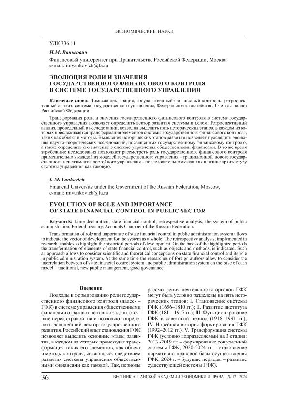 Ванькович, И.М. Эволюция роли и значения государственного финансового контроля в системе государственного управления // Вестник Алтайской академии экономики и права. – 2024. – № 12-1. — С. 36-41. — Только в электронном виде. — <URL:http://elib.fa.ru/art2024/bv3734.pdf>.