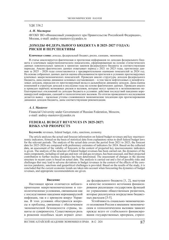 Мастеров, А.И. Доходы федерального бюджета в 2025-2027 годах: риски и перспективы // Вестник Алтайской академии экономики и права. – 2024. – № 12-1. — С. 87-93. — Только в электронном виде. — <URL:http://elib.fa.ru/art2024/bv3752.pdf>.