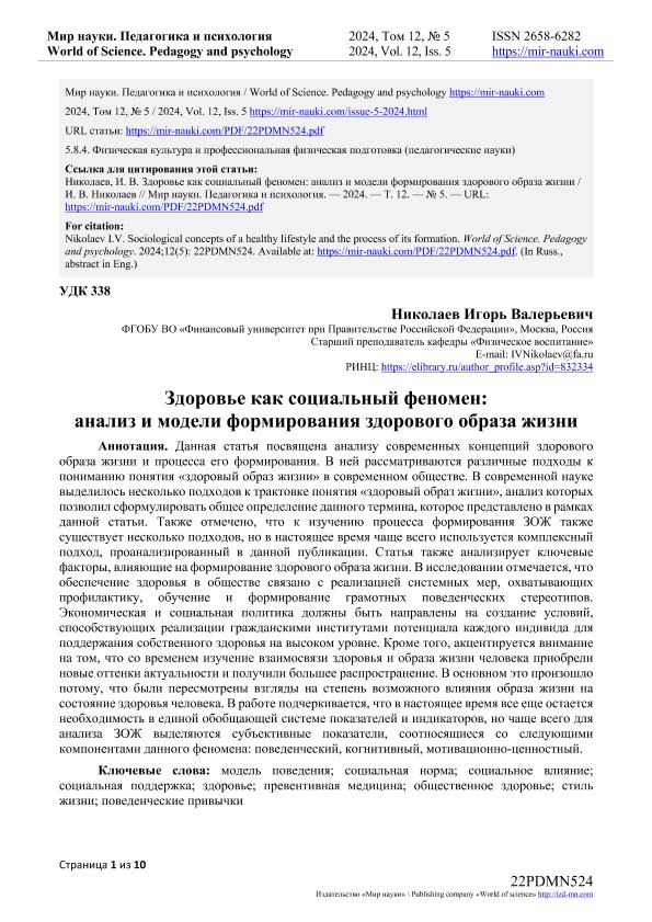 Николаев, И.В. Здоровье как социальный феномен: анализ и модели формирования здорового образа жизни. — Текст: электронный // Мир науки. Педагогика и психология. – 2024. – № 5. — URL: https://mir-nauki.com/PDF/22PDMN524.pdf (дата обращения: 28.08.2025) — <URL:http://elib.fa.ru/art2024/bv3825.pdf>.